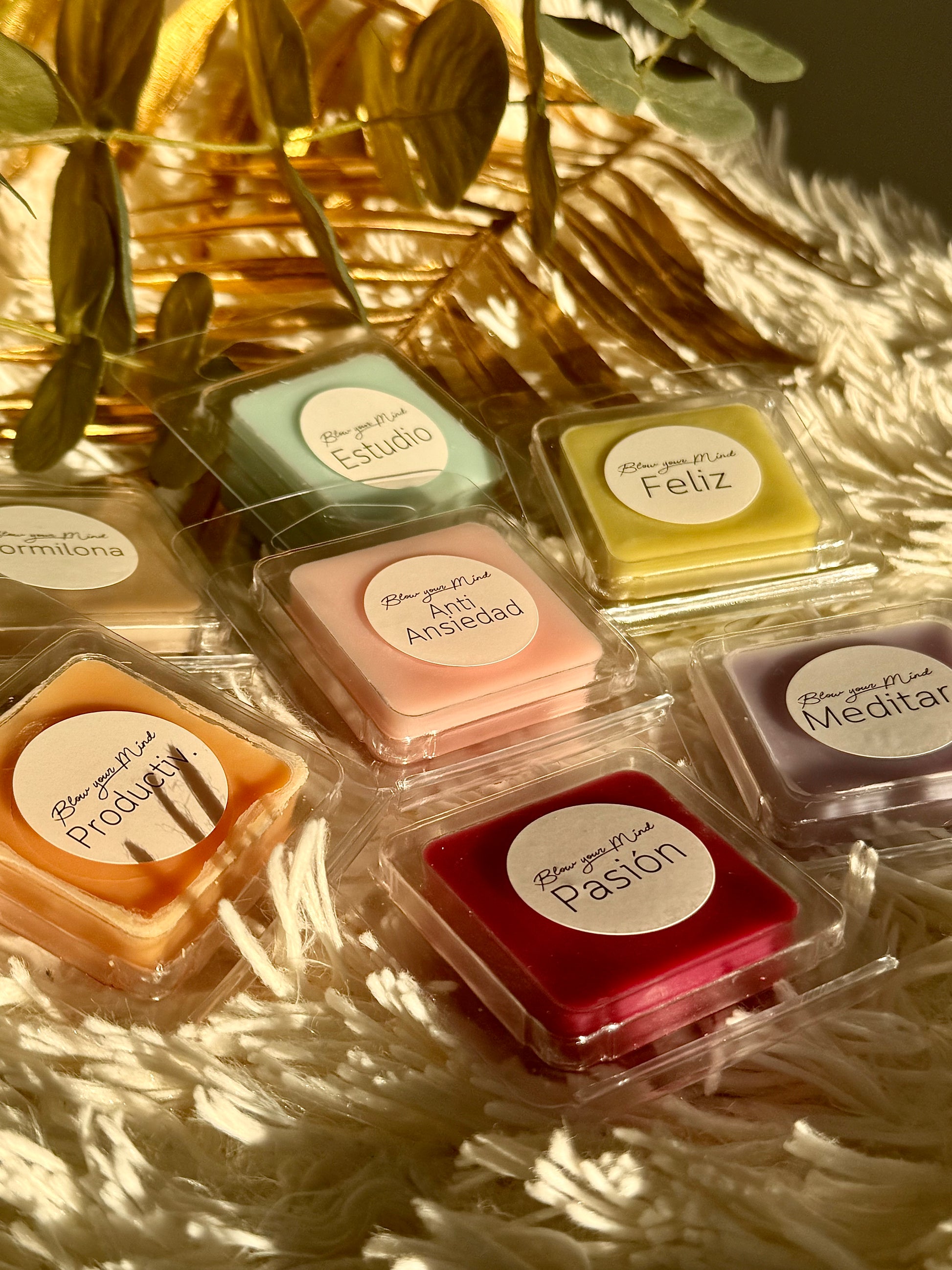 Incluye los 8 aromas del catálogo permanente de Blow Your Mind, en formato mini wax melt (un cuadradito más grande que los de las tabletas normales). Perfecto para probarlos todos o para tener variedad siempre a mano.