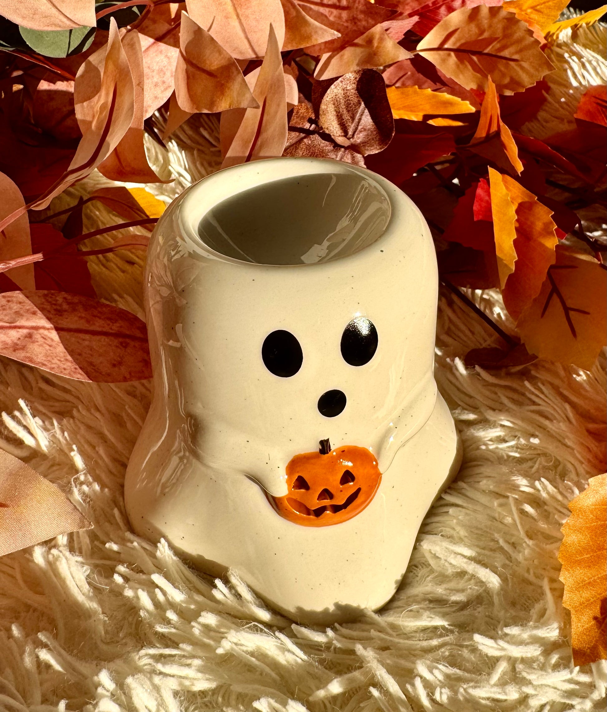 El Quemador Fantasma es pequeño y práctico, ideal para usar con tus wax melts de figuritas, especialmente con los aromas de Halloween 👻.
